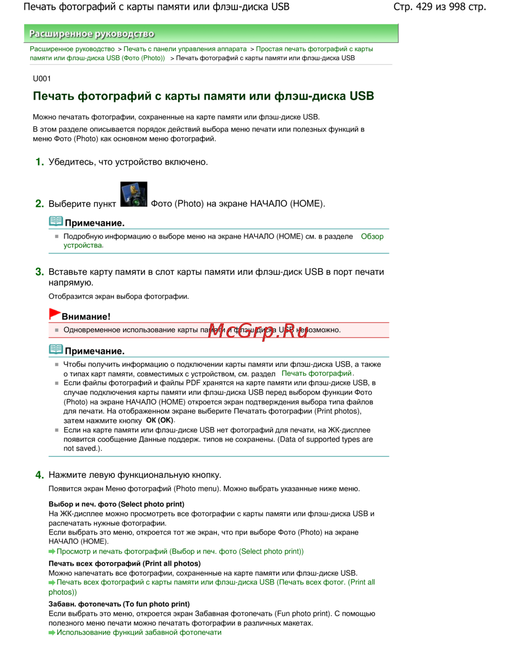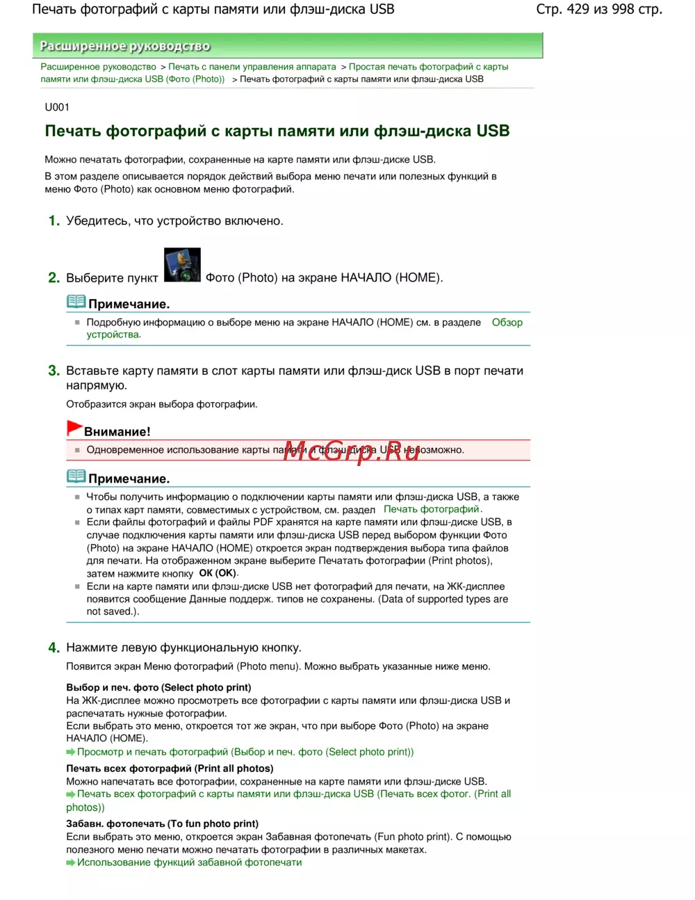 Стр. 429 из 998 стр.Печать фотографий с карты памяти или флэш-диска USB