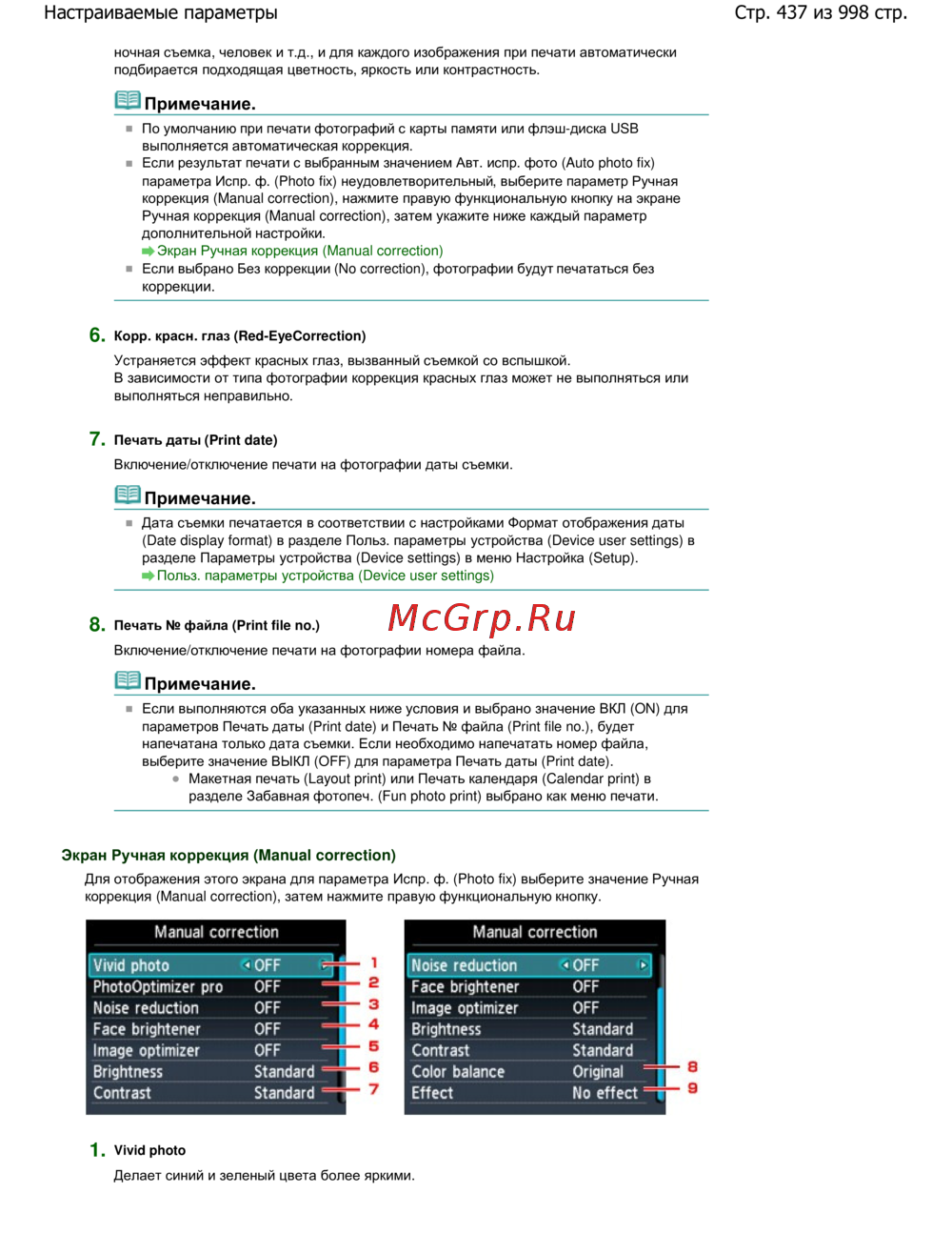 Canon Pixma MG5140 — настройки печати фотографий: коррекция цветности, устранение красных глаз и др. [437/998]