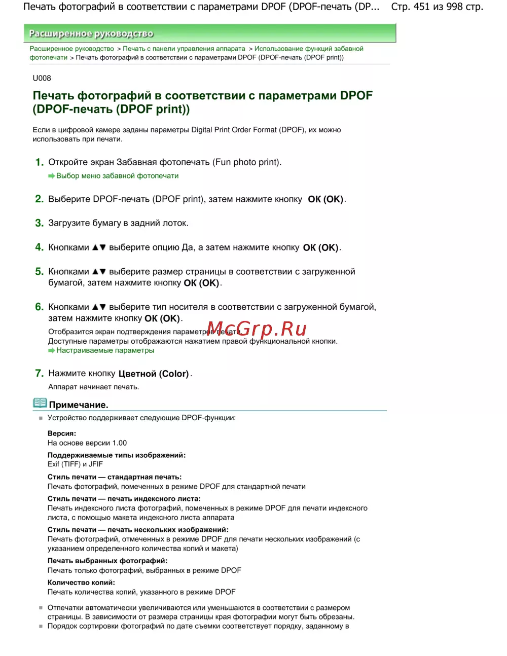 Стр. 451 из 998 стр.Печать фотографий в соответствии с параметрами DPOF (DPOF-печать (DP...