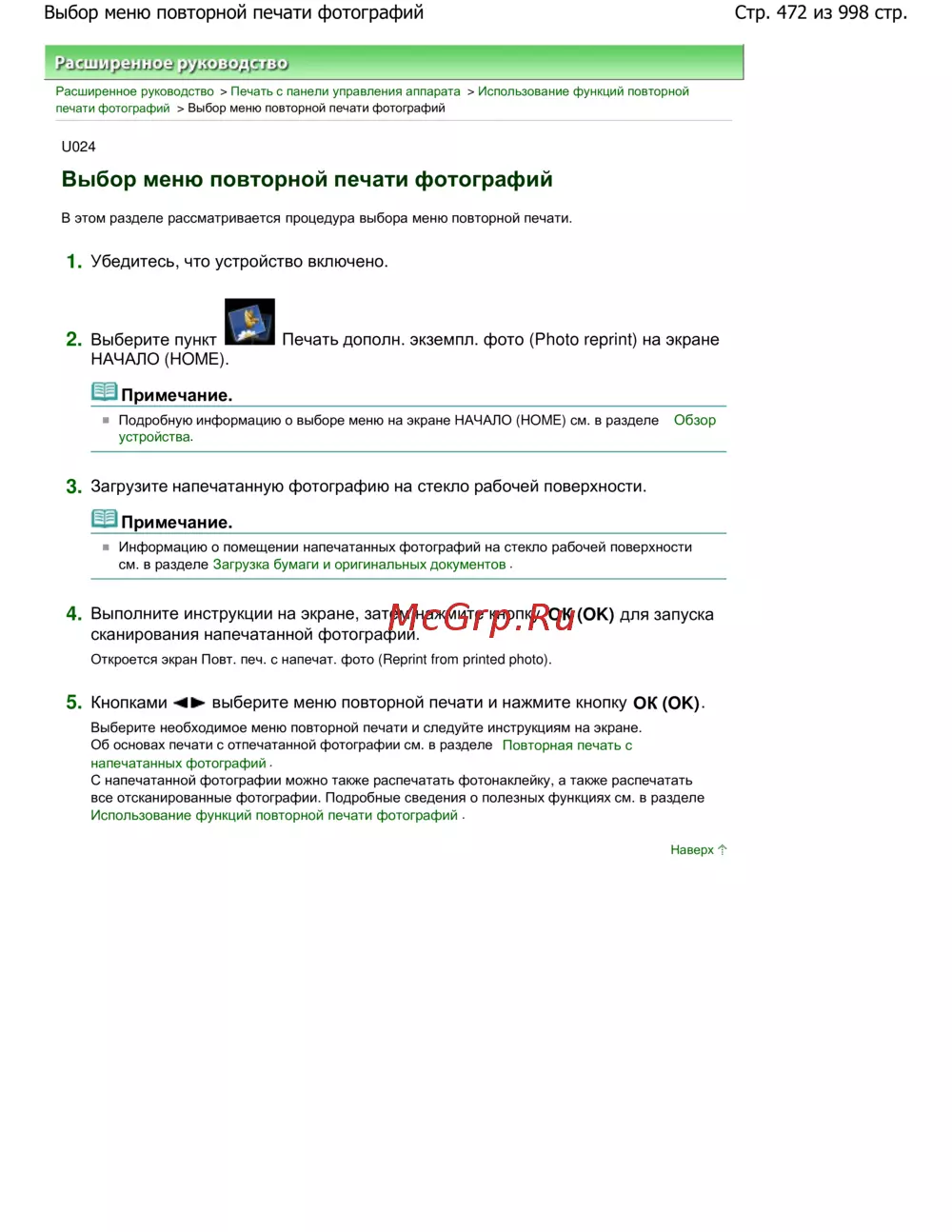 Стр. 472 из 998 стр.Выбор меню повторной печати фотографий