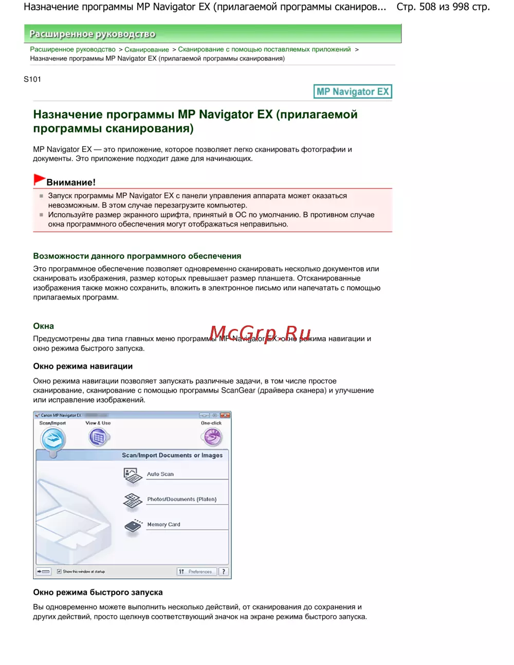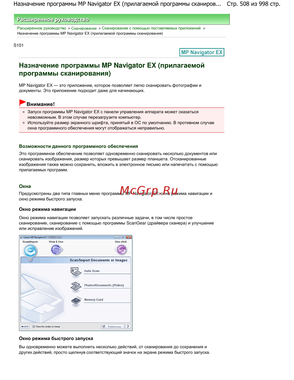 Стр. 508 из 998 стр.Назначение программы MP Navigator EX (прилагаемой программы сканиров...