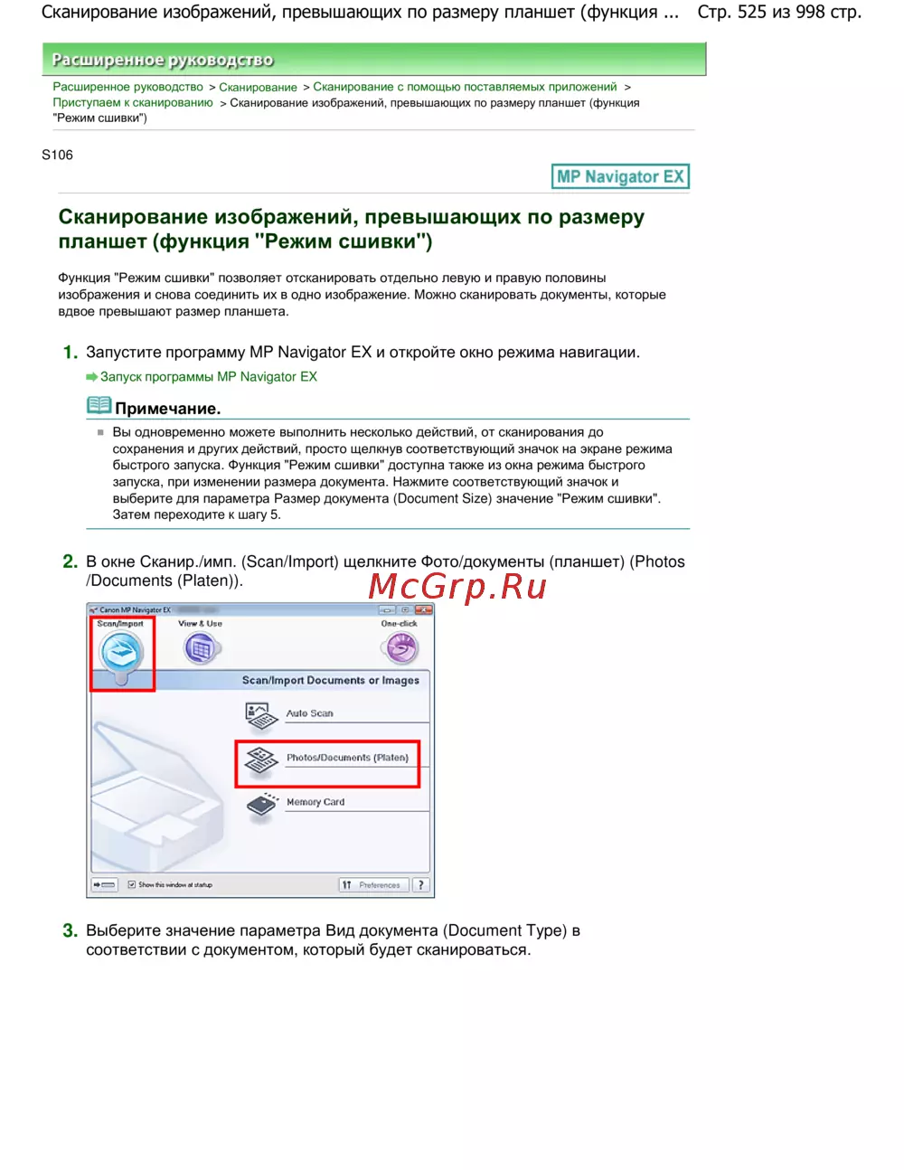 Стр. 525 из 998 стр.Сканирование изображений, превышающих по размеру планшет (функция ...