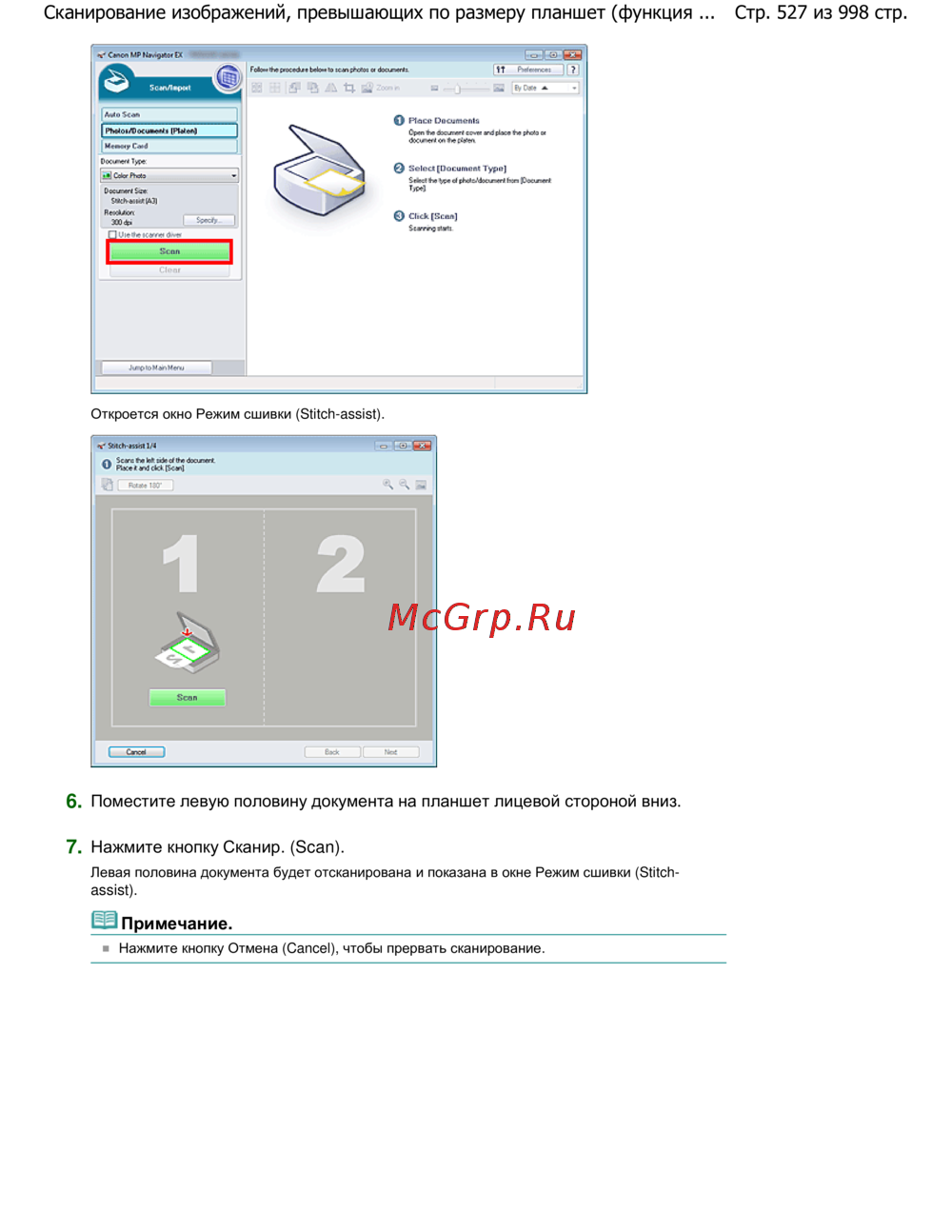 Стр. 527 из 998 стр.Сканирование изображений, превышающих по размеру планшет (функция ...