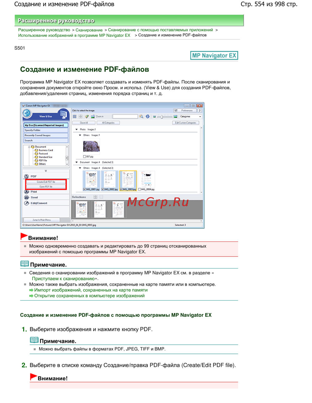 Программа MP Navigator EX позволяет создавать и изменять PDF-файлы. После сканирования и