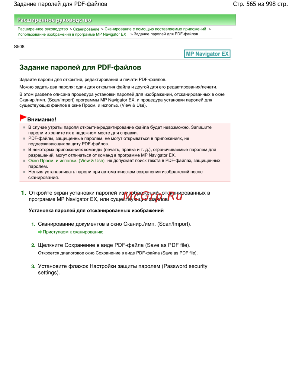 Canon Pixma MG5140 — как установить пароли для PDF в MP Navigator EX: руководство [565/998]