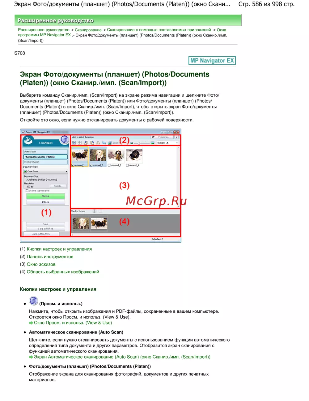 Стр. 586 из 998 стр.Экран Фото/документы (планшет) (Photos/Documents (Platen)) (окно Скани...