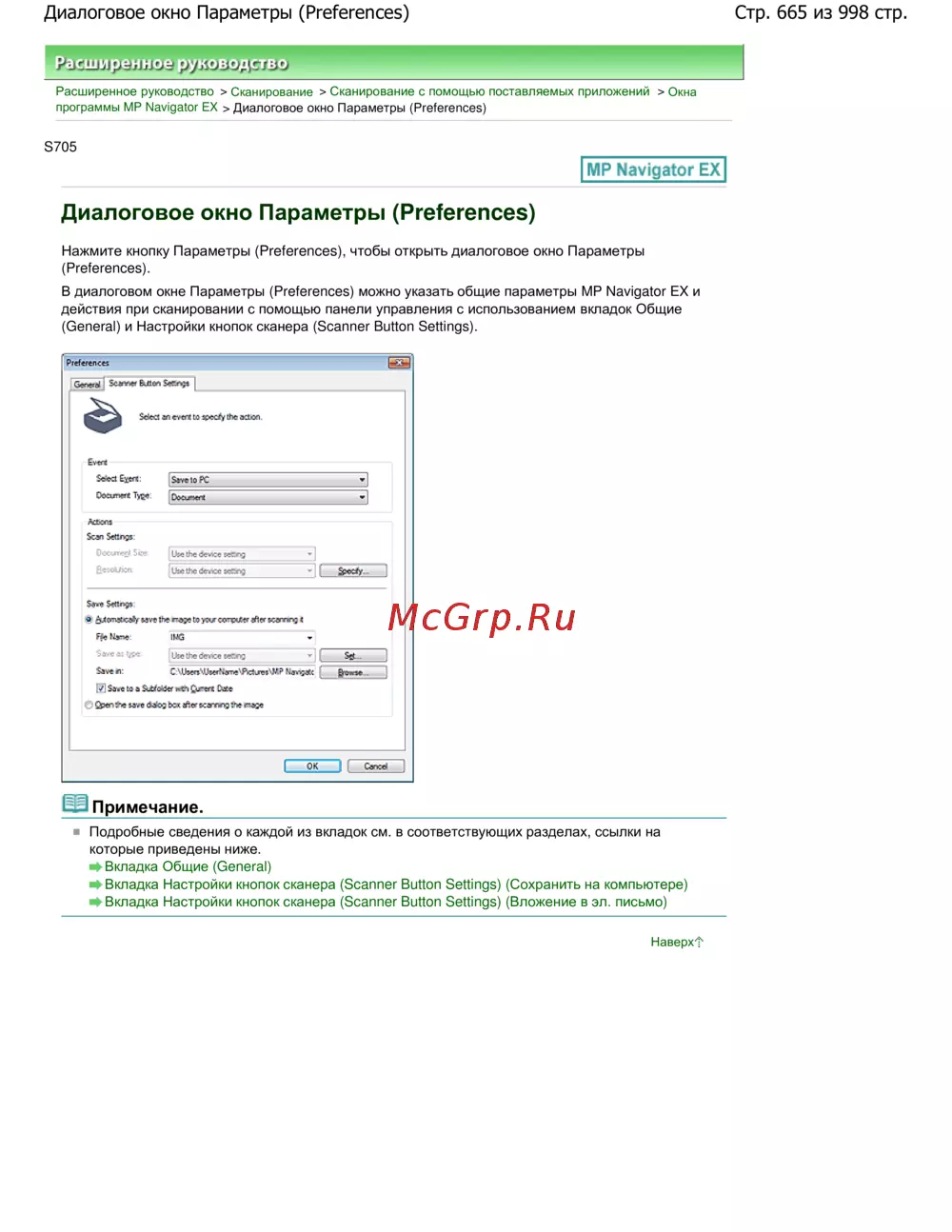 Canon Pixma MG5140 — настройки сканирования в MP Navigator EX: руководство к диалоговому окну Preferences [665/998]
