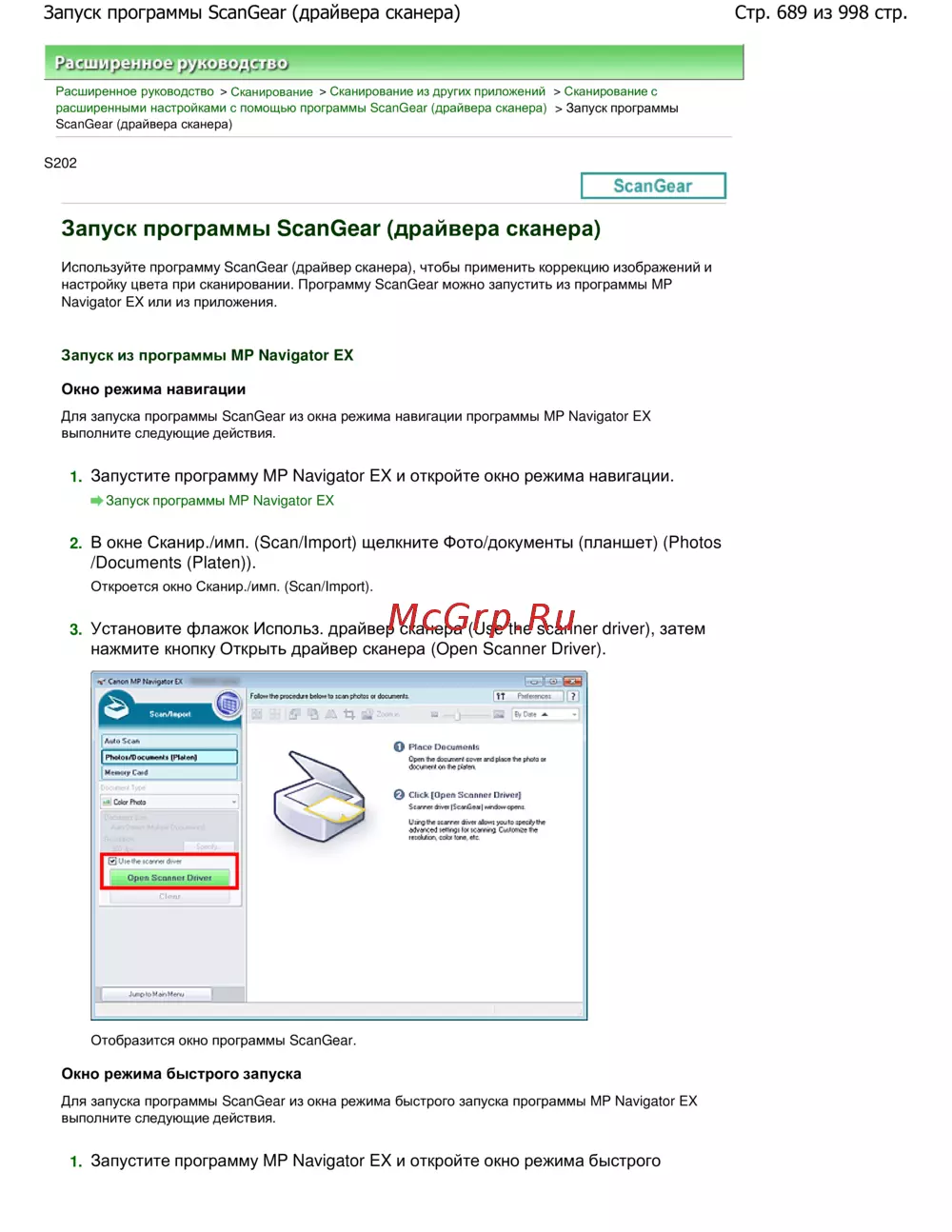 Стр. 689 из 998 стр.Запуск программы ScanGear (драйвера сканера)