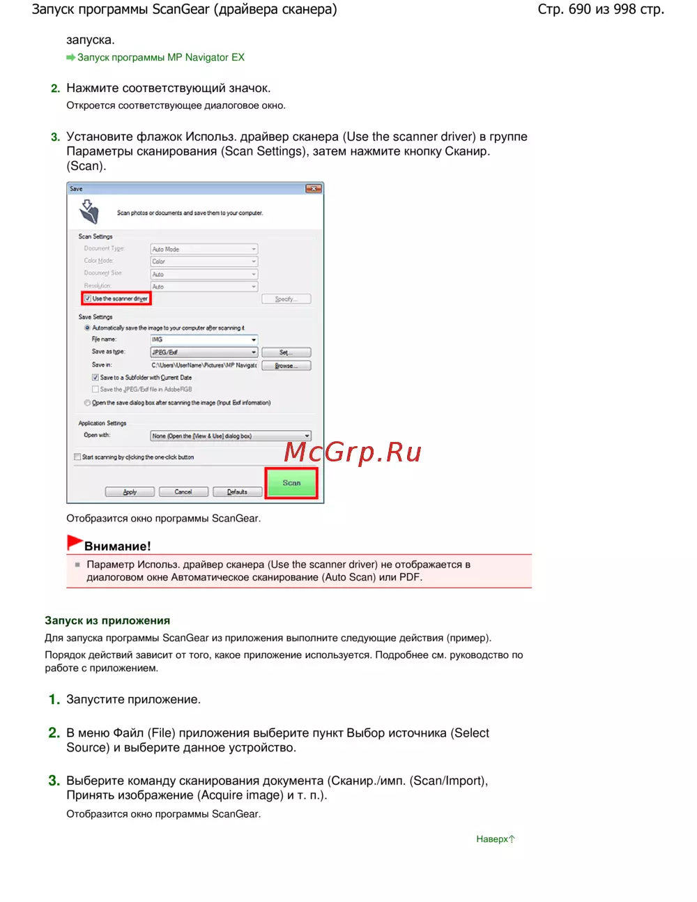 Стр. 690 из 998 стр.Запуск программы ScanGear (драйвера сканера)
