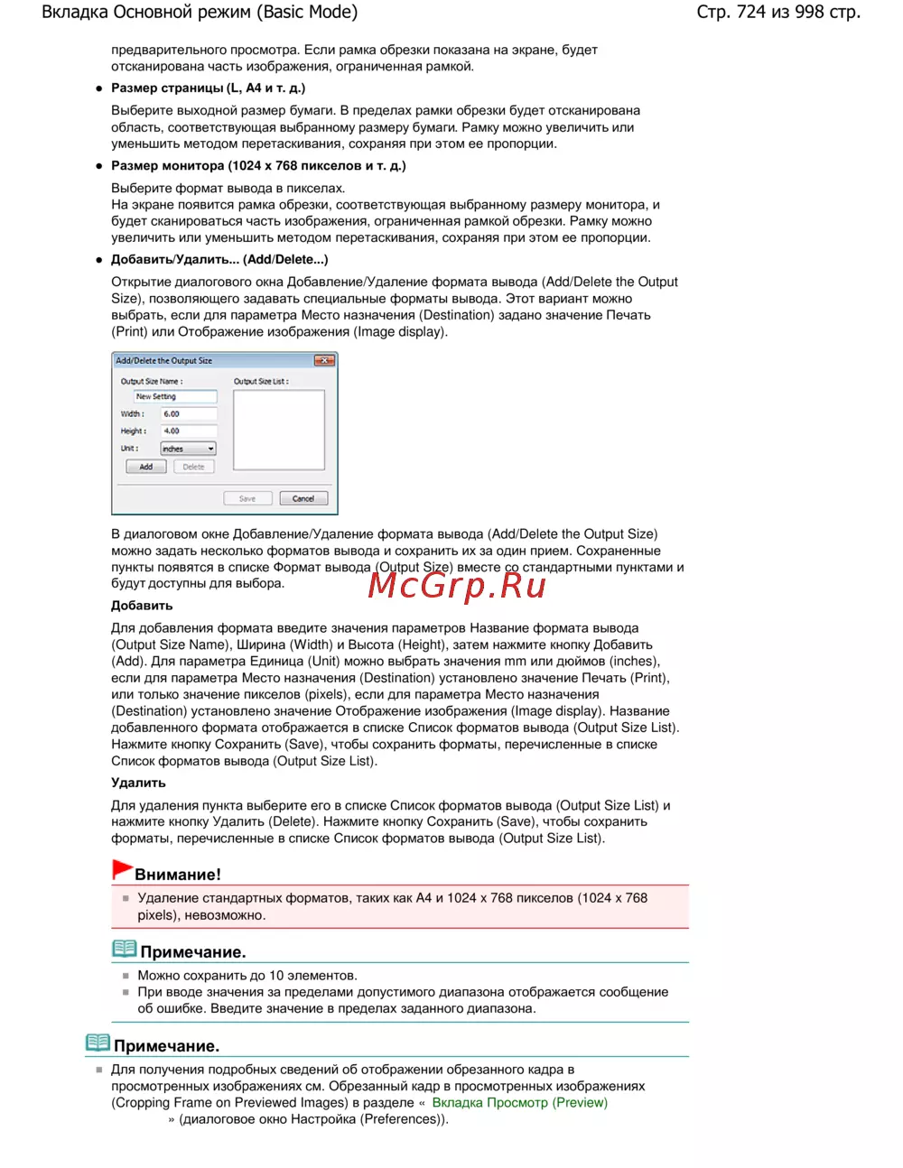 Инструкция по настройке параметров обрезки изображений. Выберите размер бумаги или пикселов, используйте рамку для ограничения сканирования, добавляйте/удаляйте пользовательские форматы вывода с сохранением.