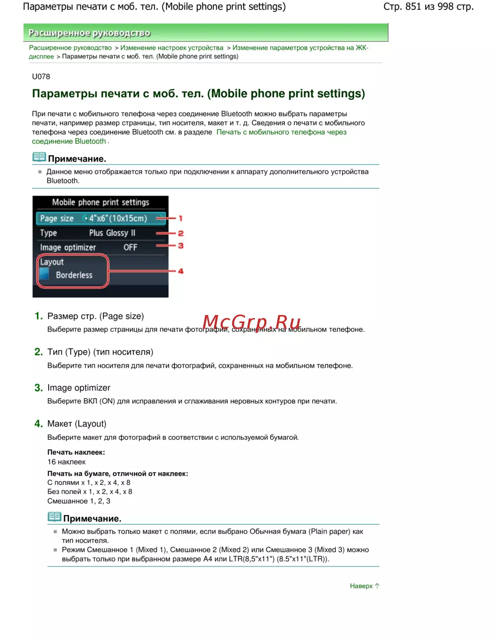 Стр. 851 из 998 стр.Параметры печати с моб. тел. (Mobile phone print settings)