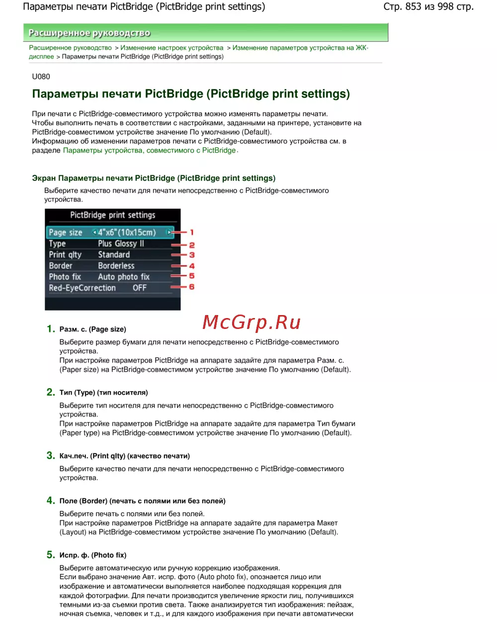 Canon Pixma MG5140 — настройки печати PictBridge: Полное руководство по параметрам [853/998]