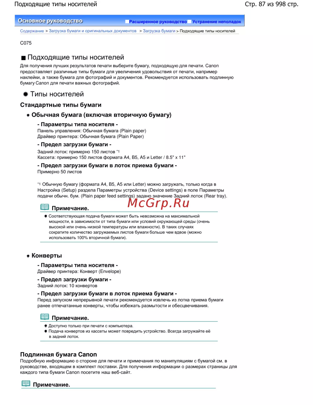 Canon Pixma MG5140 — руководство по выбору бумаги для печати и устранению неполадок [87/998]