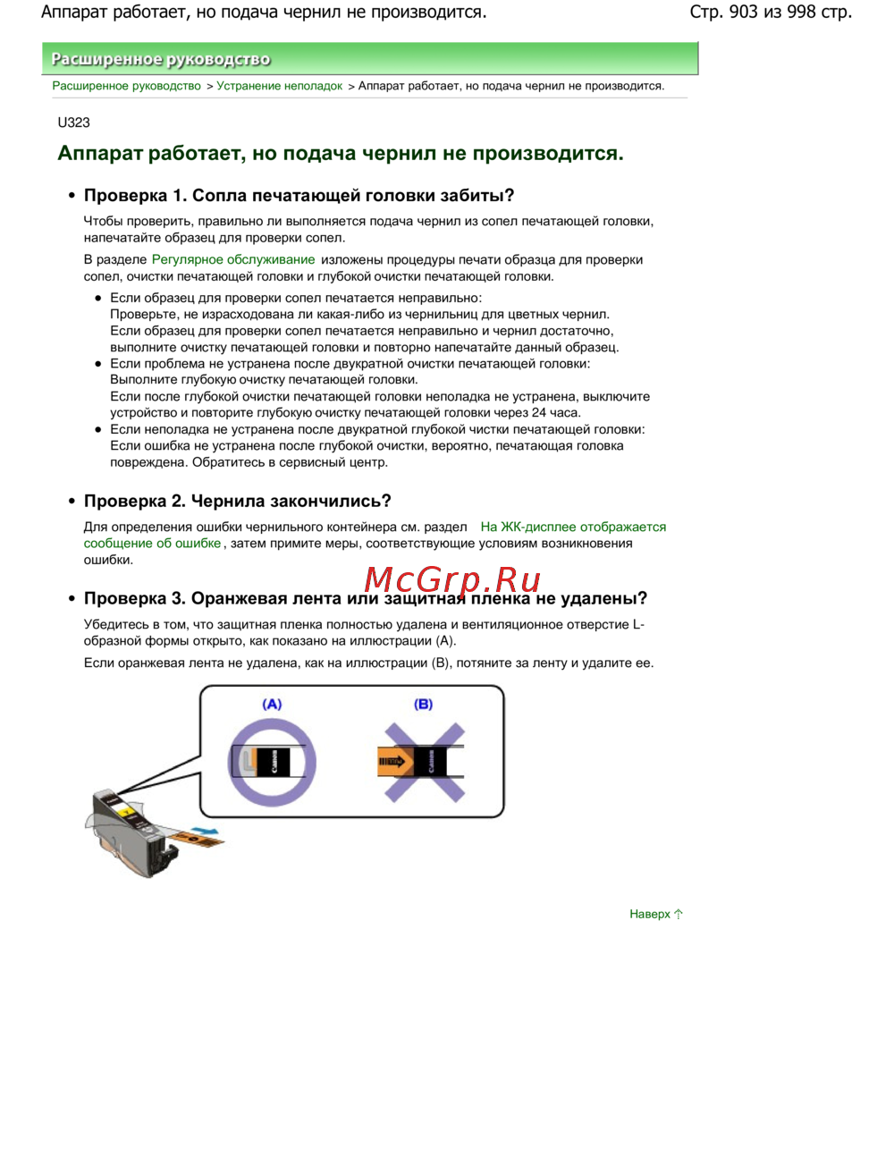 Стр. 903 из 998 стр.Аппарат работает, но подача чернил не производится.