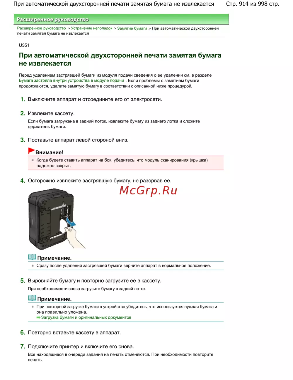 Стр. 914 из 998 стр.При автоматической двухсторонней печати замятая бумага не извлекается