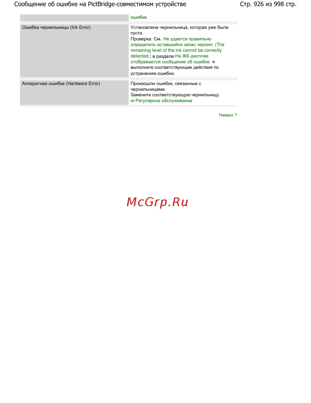 Стр. 926 из 998 стр.Сообщение об ошибке на PictBridge-совместимом устройстве