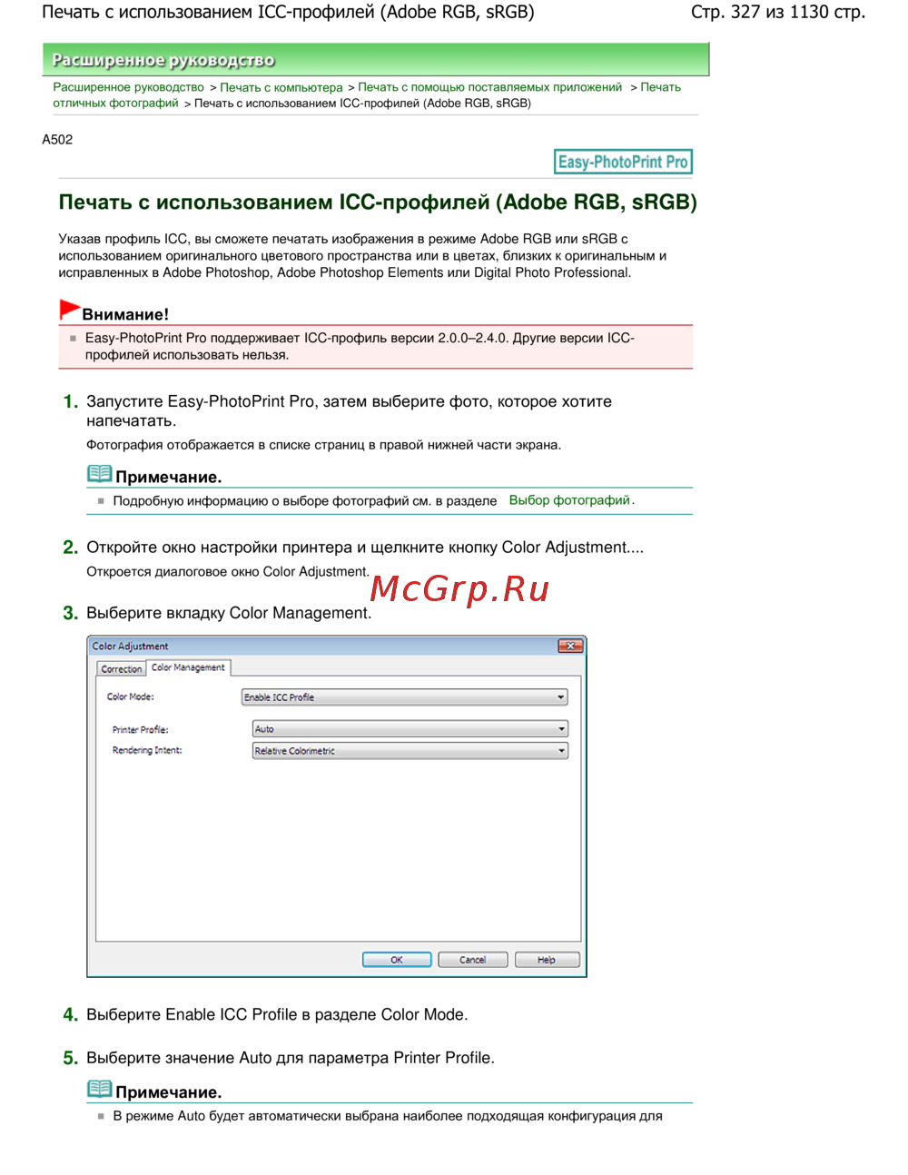 Стр. 327 из 1130 стр.Печать с использованием ICC-профилей (Adobe RGB, sRGB)