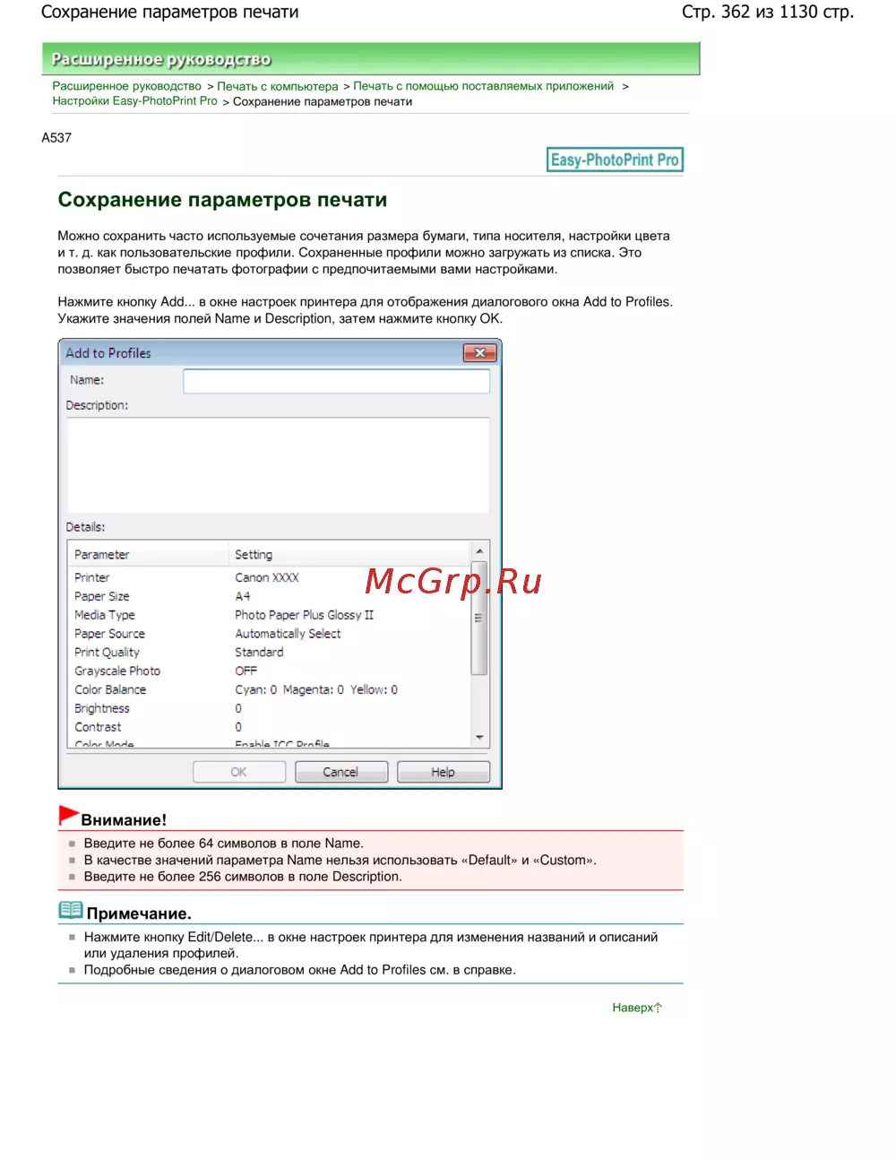 Стр. 362 из 1130 стр.Сохранение параметров печати
