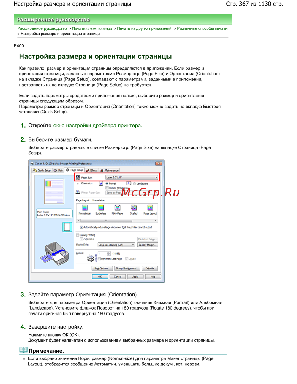 Canon Pixma MG6140 — настройка размера и ориентации страницы для печати с компьютера [367/1130]