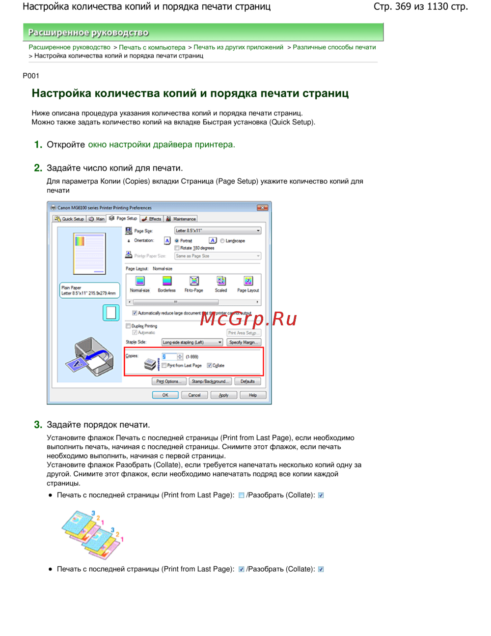 Стр. 369 из 1130 стр.Настройка количества копий и порядка печати страниц
