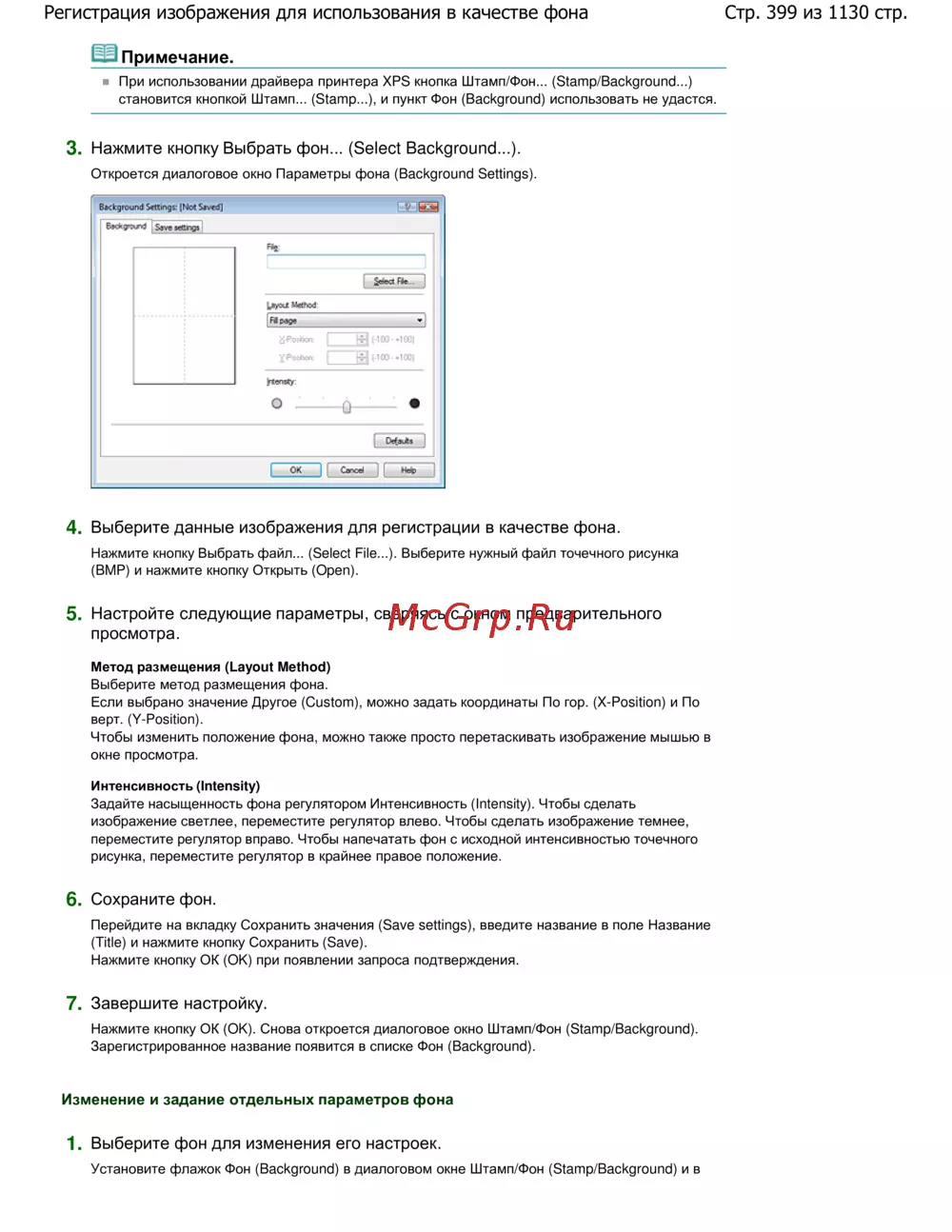 Инструкция по настройке параметров фона в драйверах принтеров, включая выбор метода размещения, регулировку интенсивности и сохранение настроек. Руководство по использованию.