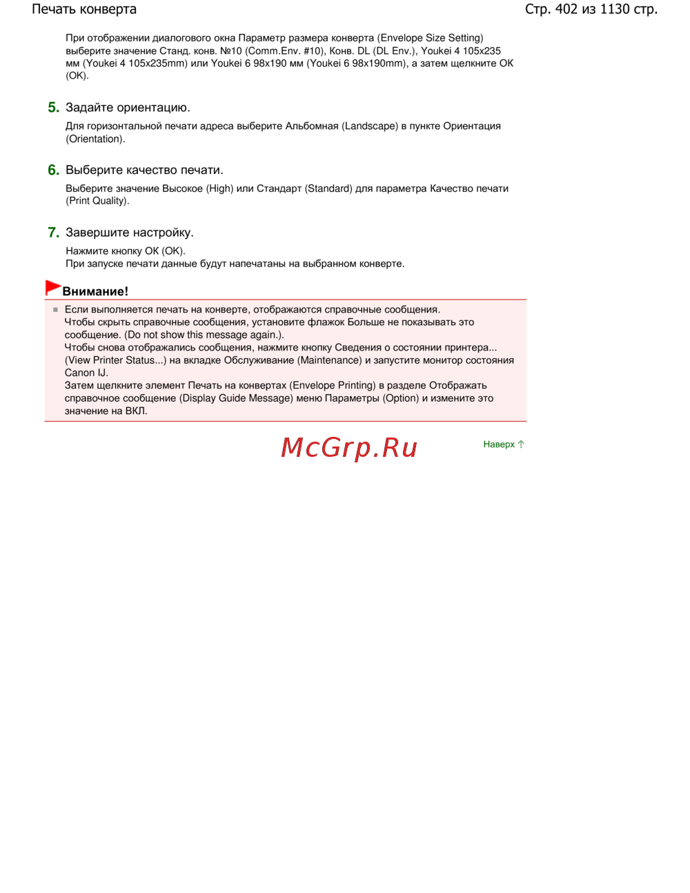 Инструкция по настройке печати конвертов на принтерах Canon. Выбор размера, ориентации, качества и управление сообщениями для печати конвертов.