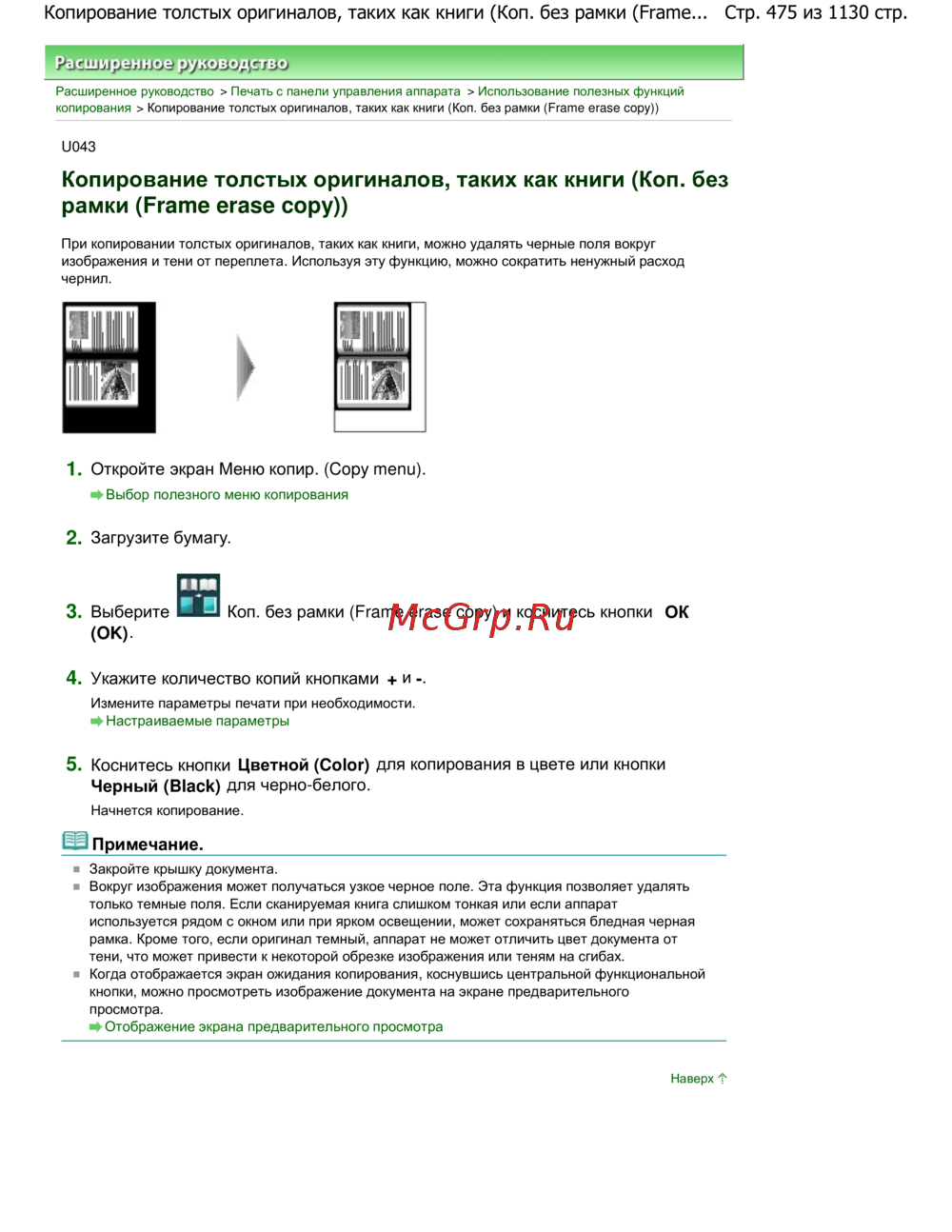 Стр. 475 из 1130 стр.Копирование толстых оригиналов, таких как книги (Коп. без рамки (Frame...
