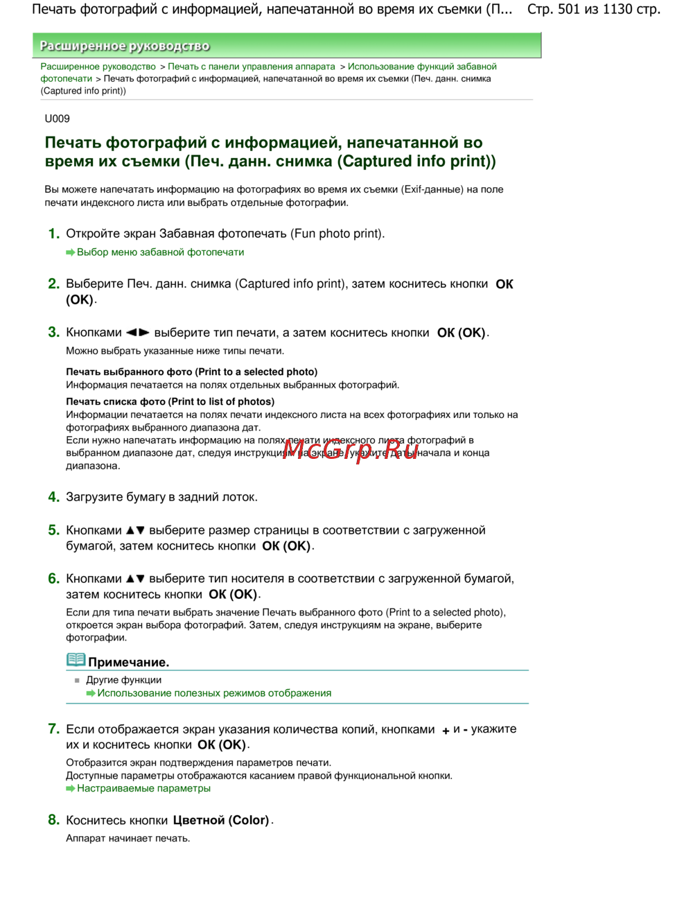 Стр. 501 из 1130 стр.Печать фотографий с информацией, напечатанной во время их съемки (П...
