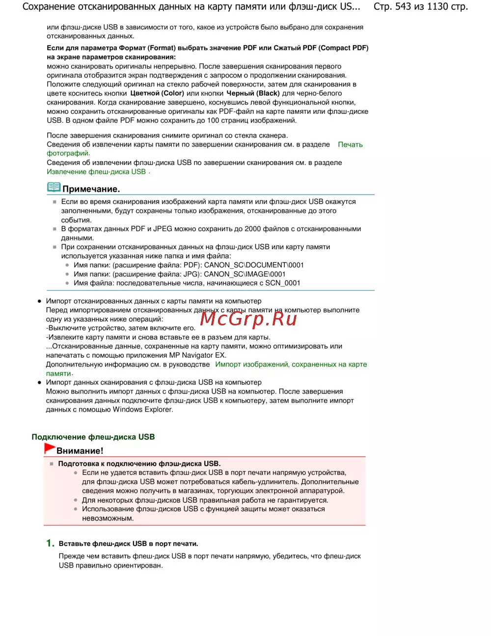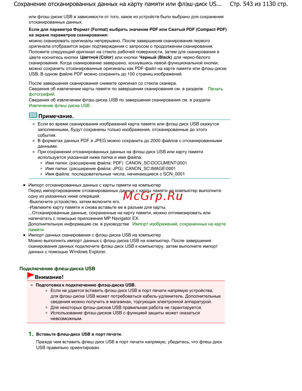 Стр. 543 из 1130 стр.Сохранение отсканированных данных на карту памяти или флэш-диск US...