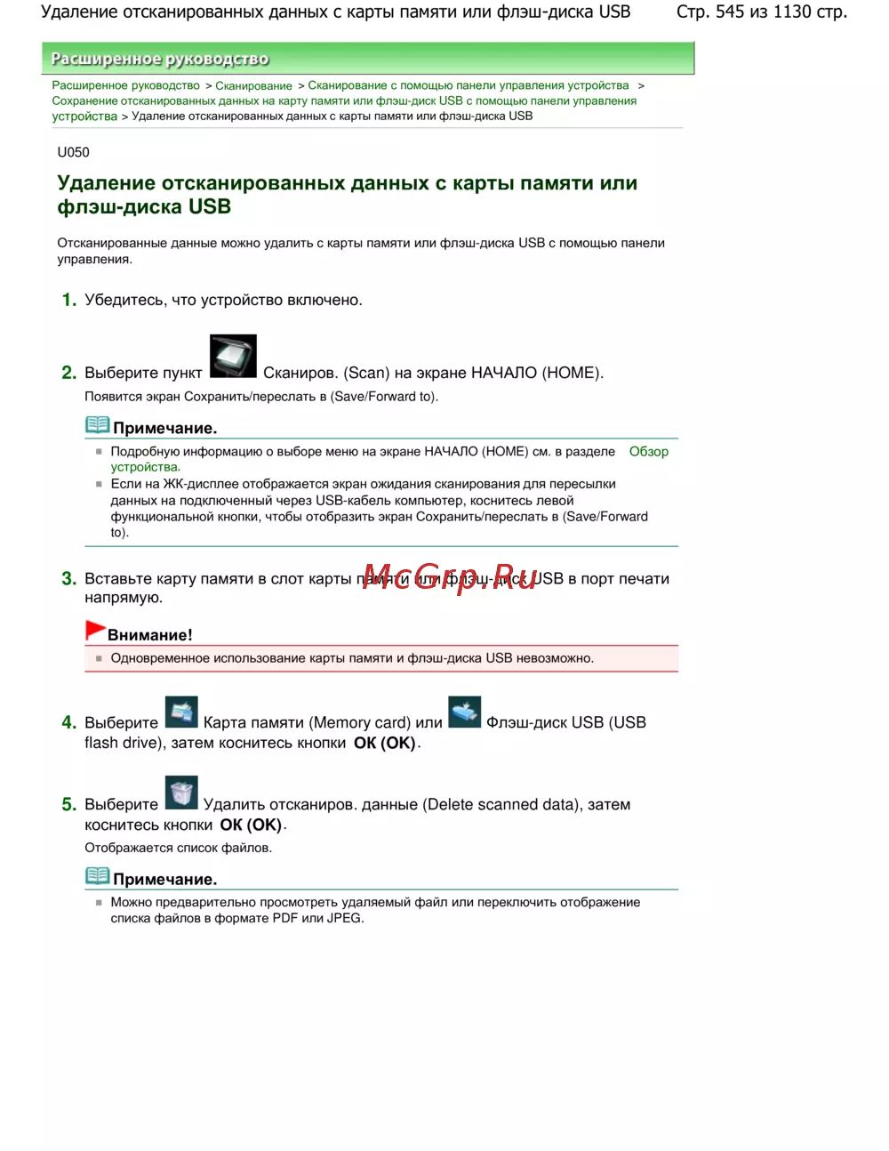 Стр. 545 из 1130 стр.Удаление отсканированных данных с карты памяти или флэш-диска USB
