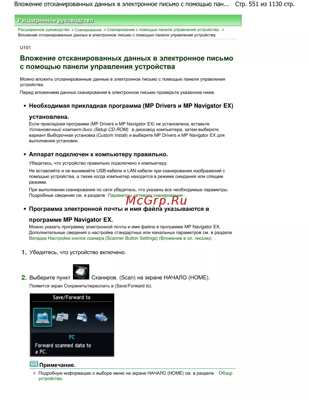 Стр. 551 из 1130 стр.Вложение отсканированных данных в электронное письмо с помощью пан...