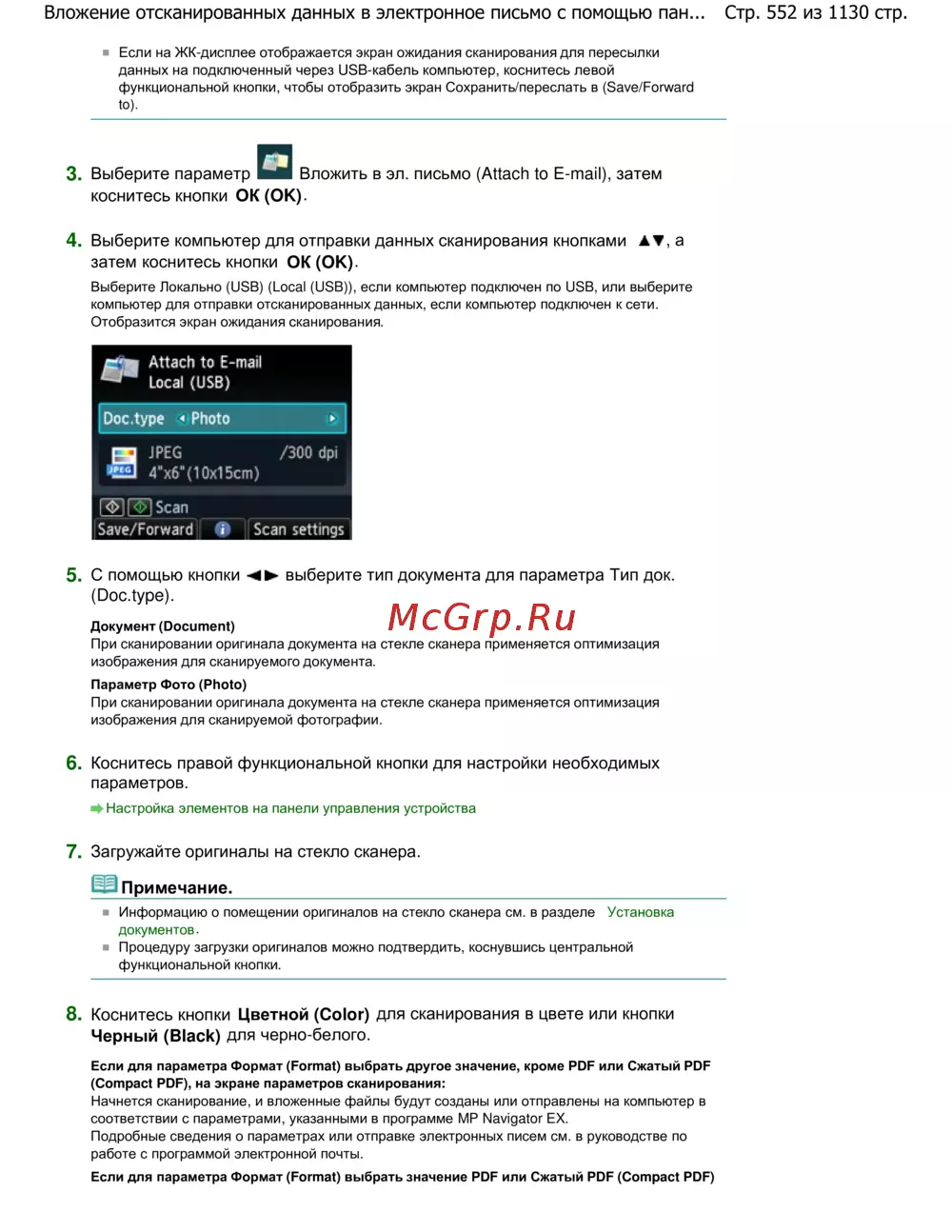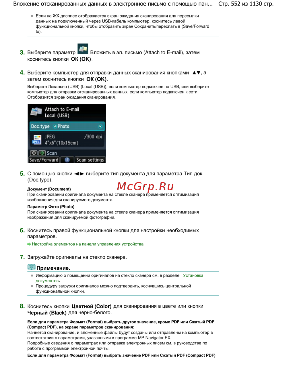 Стр. 552 из 1130 стр.Вложение отсканированных данных в электронное письмо с помощью пан...