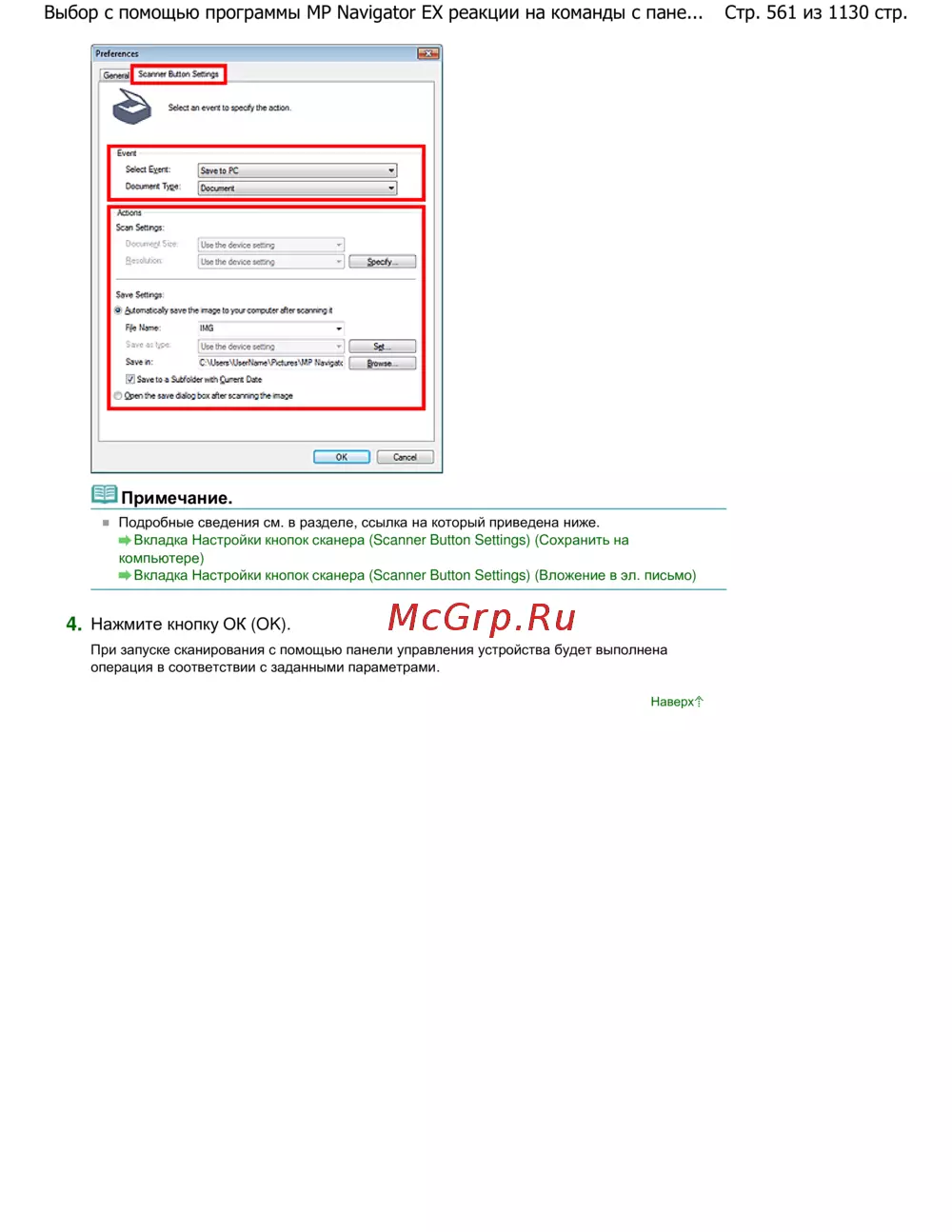 Стр. 561 из 1130 стр.Выбор с помощью программы MP Navigator EX реакции на команды с пане...
