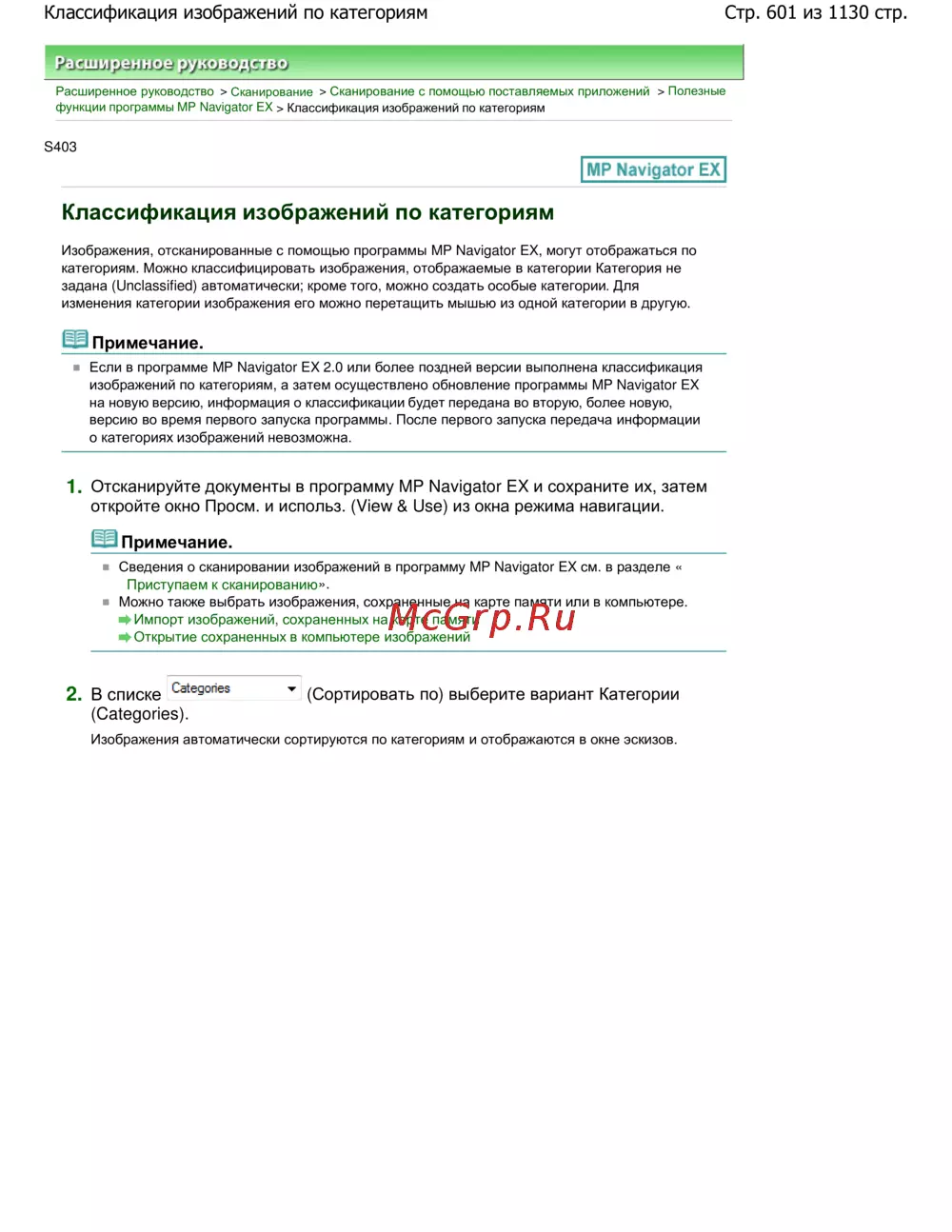 изображений по категориям, а затем осуществлено обновление программы MP Navigator EX
