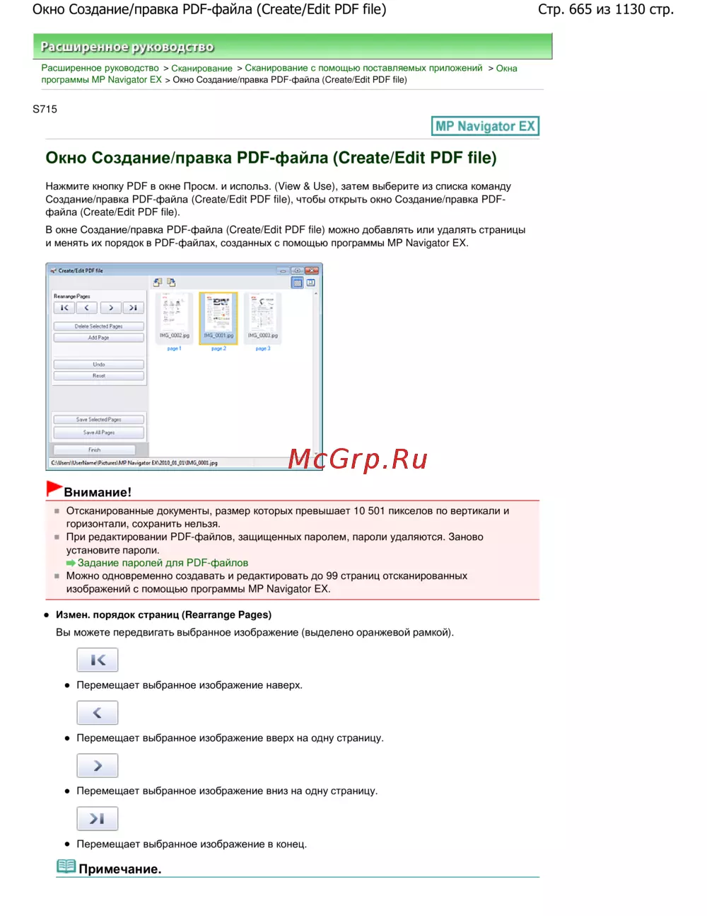Инструкция по созданию и редактированию PDF-файлов в MP Navigator EX. Изменение порядка страниц, удаление паролей и работа с ограничениями размера документа.