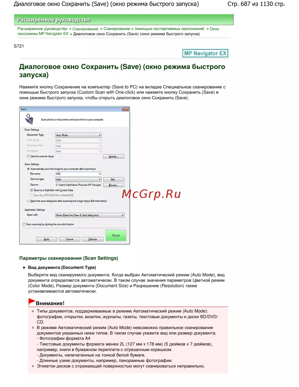 Узнайте, как использовать диалоговое окно Сохранить в MP Navigator EX для сохранения сканированных документов. Настройки автоматического режима и рекомендации по типам документов.