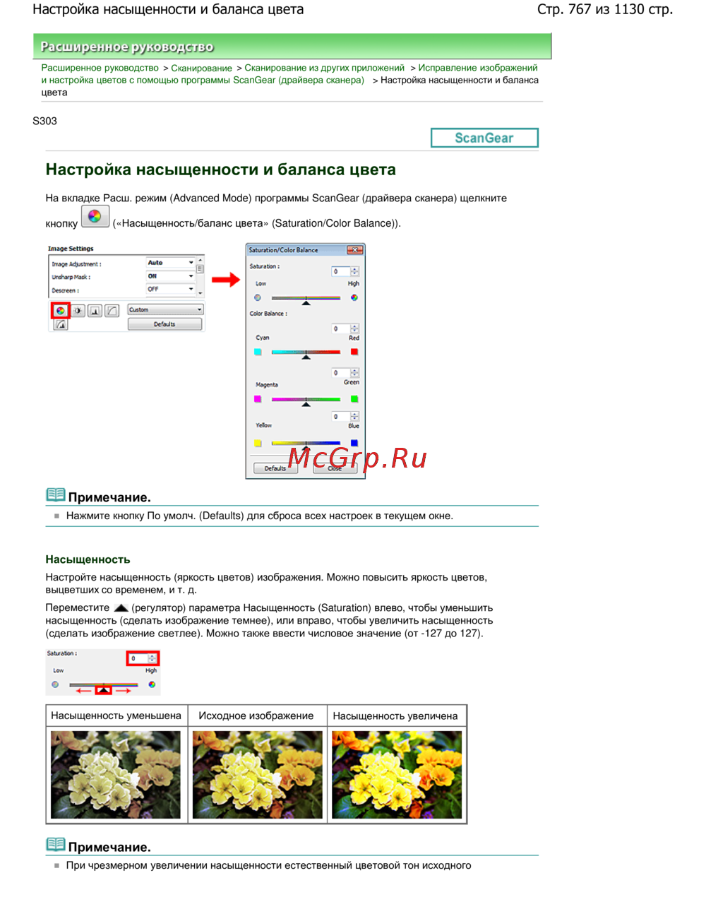 и настройка цветов с помощью программы ScanGear (драйвера сканера) > Настройка насыщенности и баланса