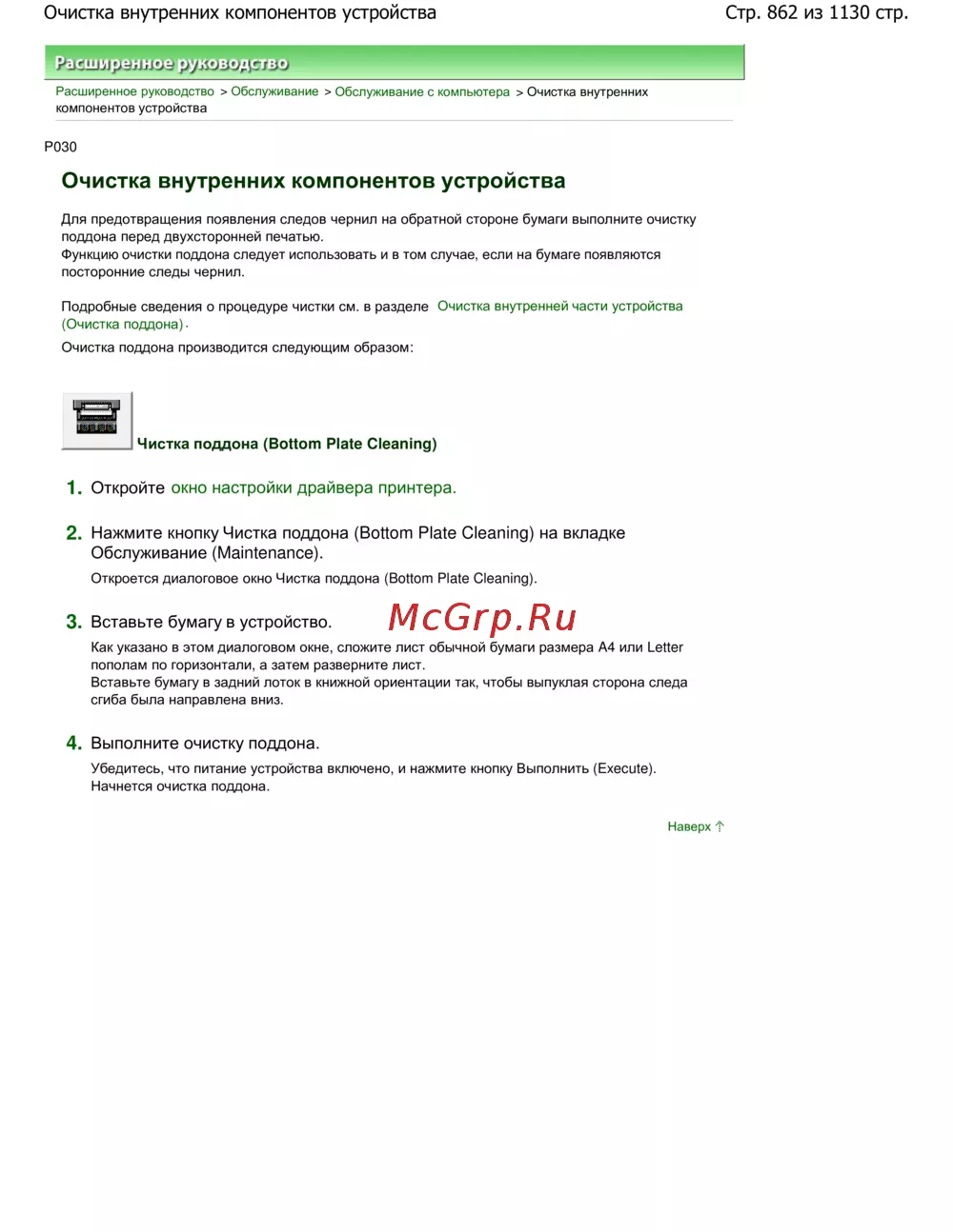 Нажмите кнопку Чистка поддона (Bottom Plate Cleaning) на вкладке