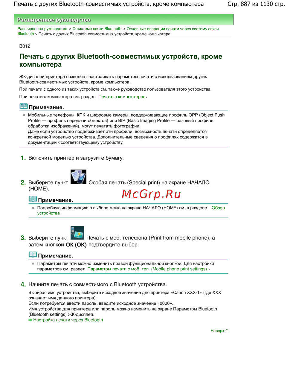 Стр. 887 из 1130 стр.Печать с других Bluetooth-совместимых устройств, кроме компьютера