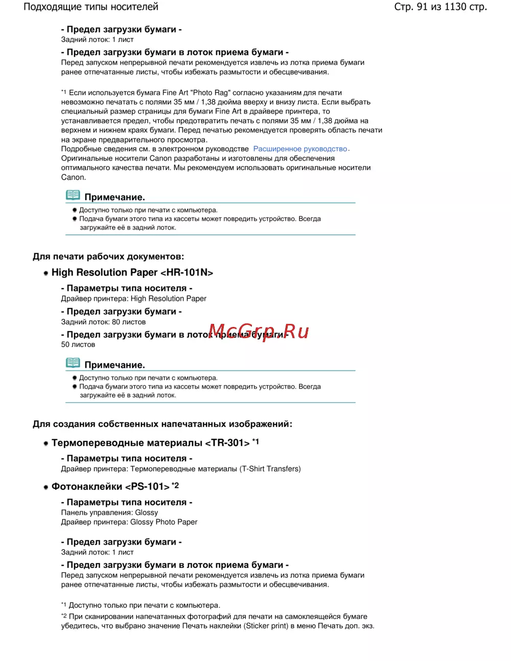 Canon Pixma MG6140 — рекомендации по загрузке бумаги для печати и типам носителей [91/1130]