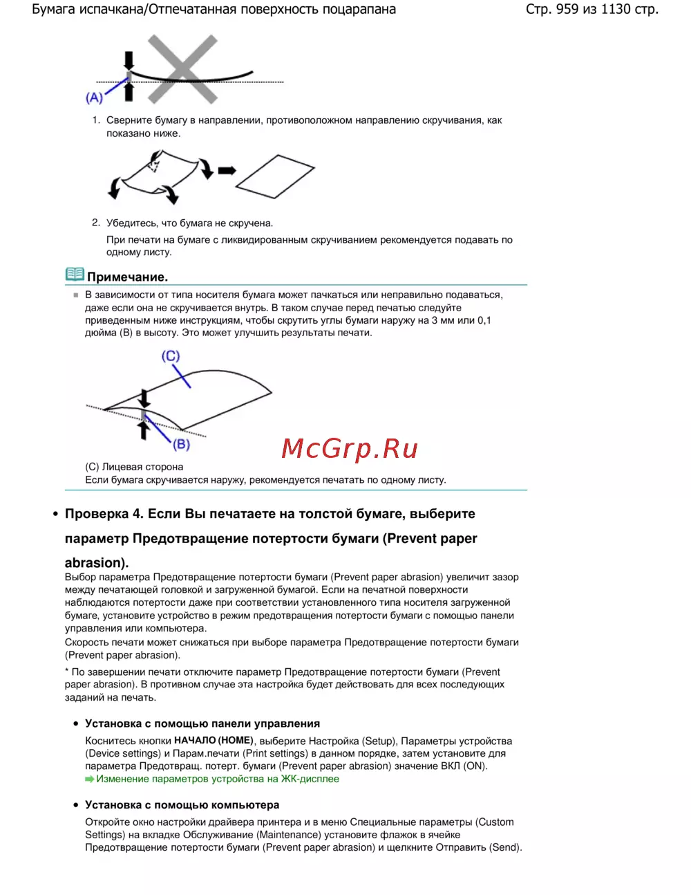 бумаге, установите устройство в режим предотвращения потертости бумаги с помощью панели