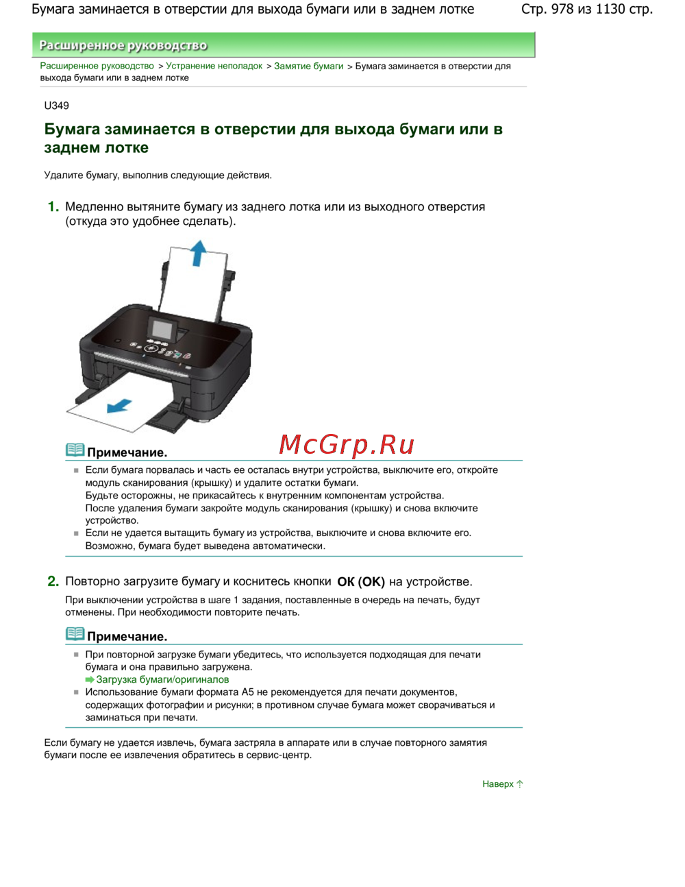 Стр. 978 из 1130 стр.Бумага заминается в отверстии для выхода бумаги или в заднем лотке