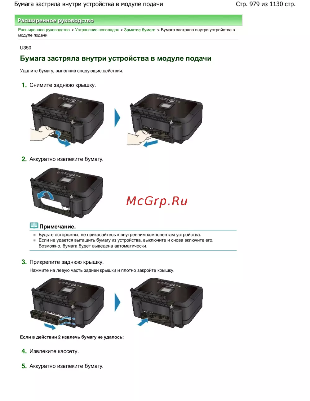Стр. 979 из 1130 стр.Бумага застряла внутри устройства в модуле подачи