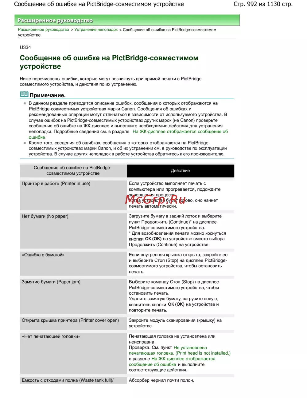 Стр. 992 из 1130 стр.Сообщение об ошибке на PictBridge-совместимом устройстве