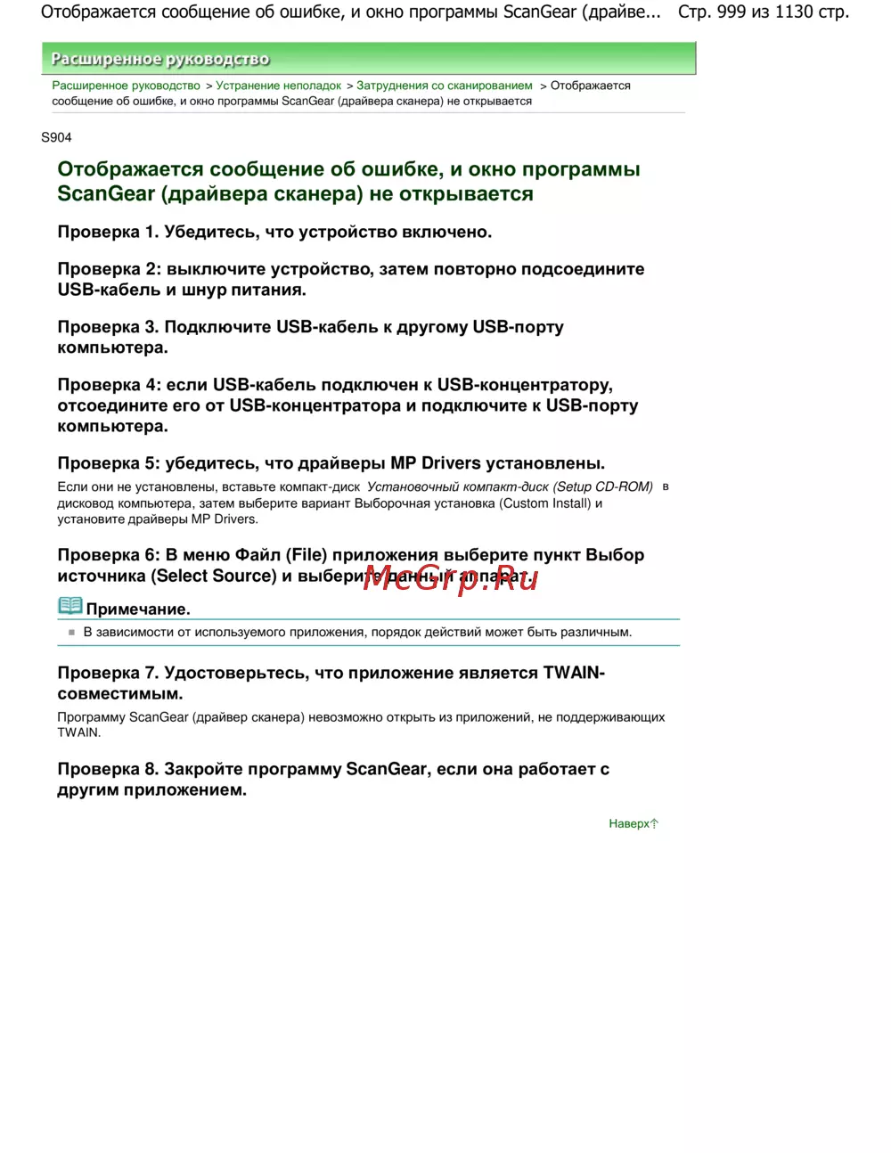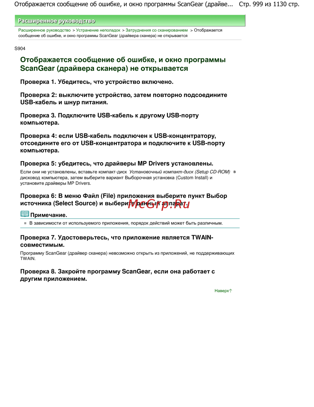 Стр. 999 из 1130 стр.Отображается сообщение об ошибке, и окно программы ScanGear (драйве...