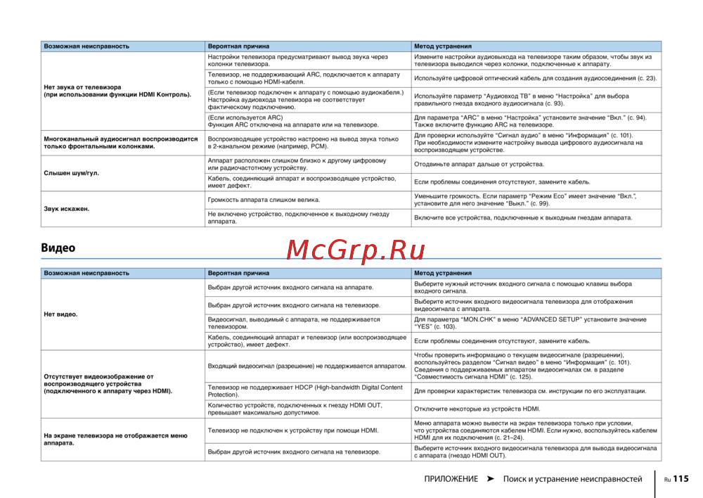 ПРИЛОЖЕНИЕ ➤ Поиск и устранение неисправностей Ru 115