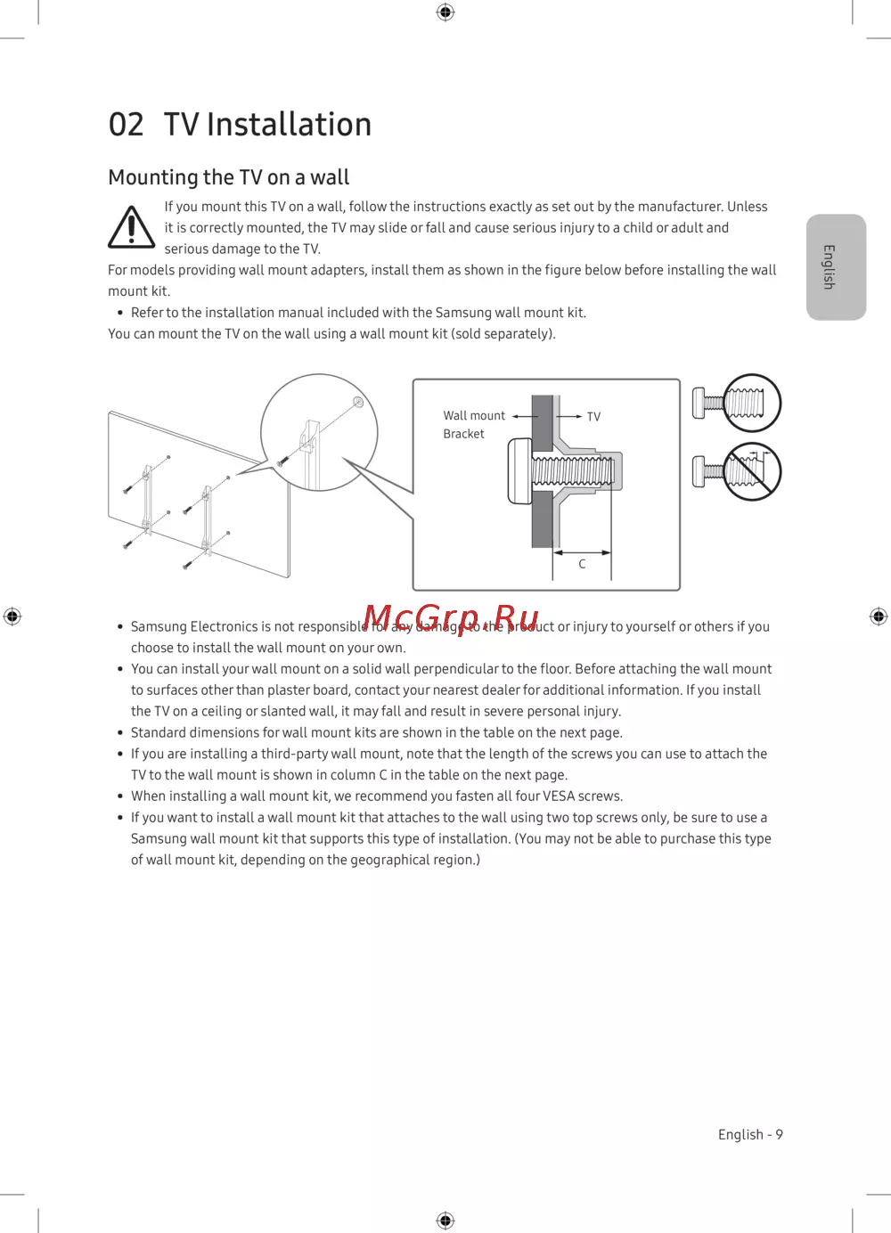 - Меры предосторожности надежное крепление телевизора к стене p.11