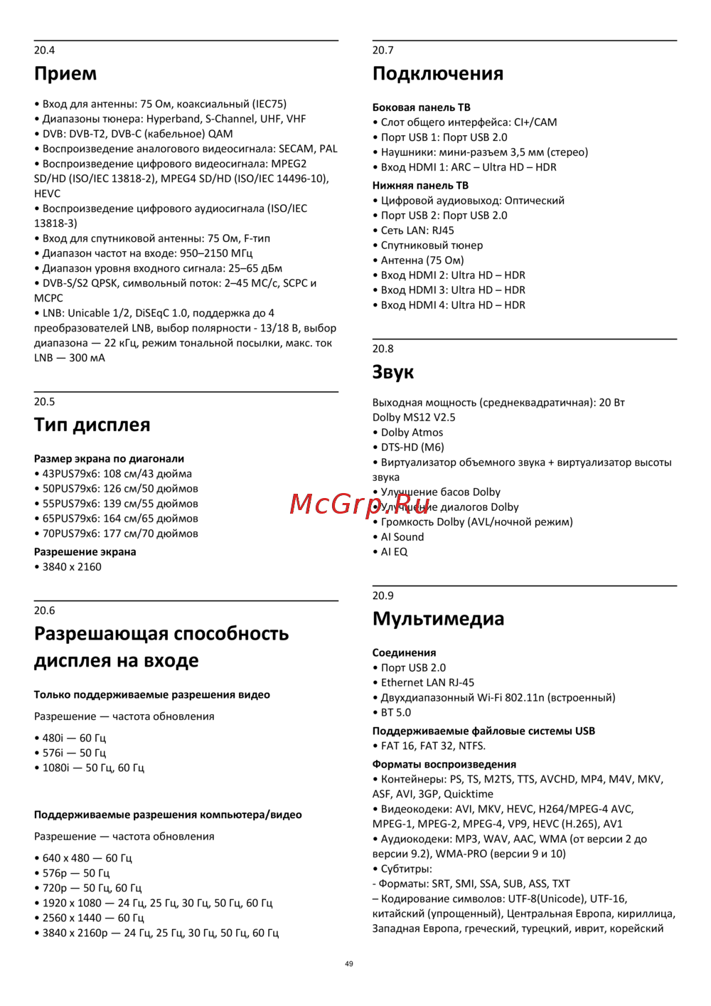 • DVB: DVB-T2, DVB-C (кабельное) QAM