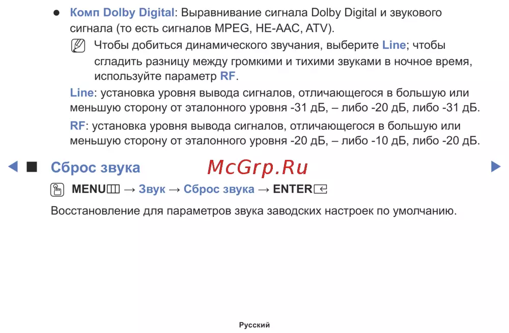 Восстановление для параметров звука заводских настроек по умолчанию.