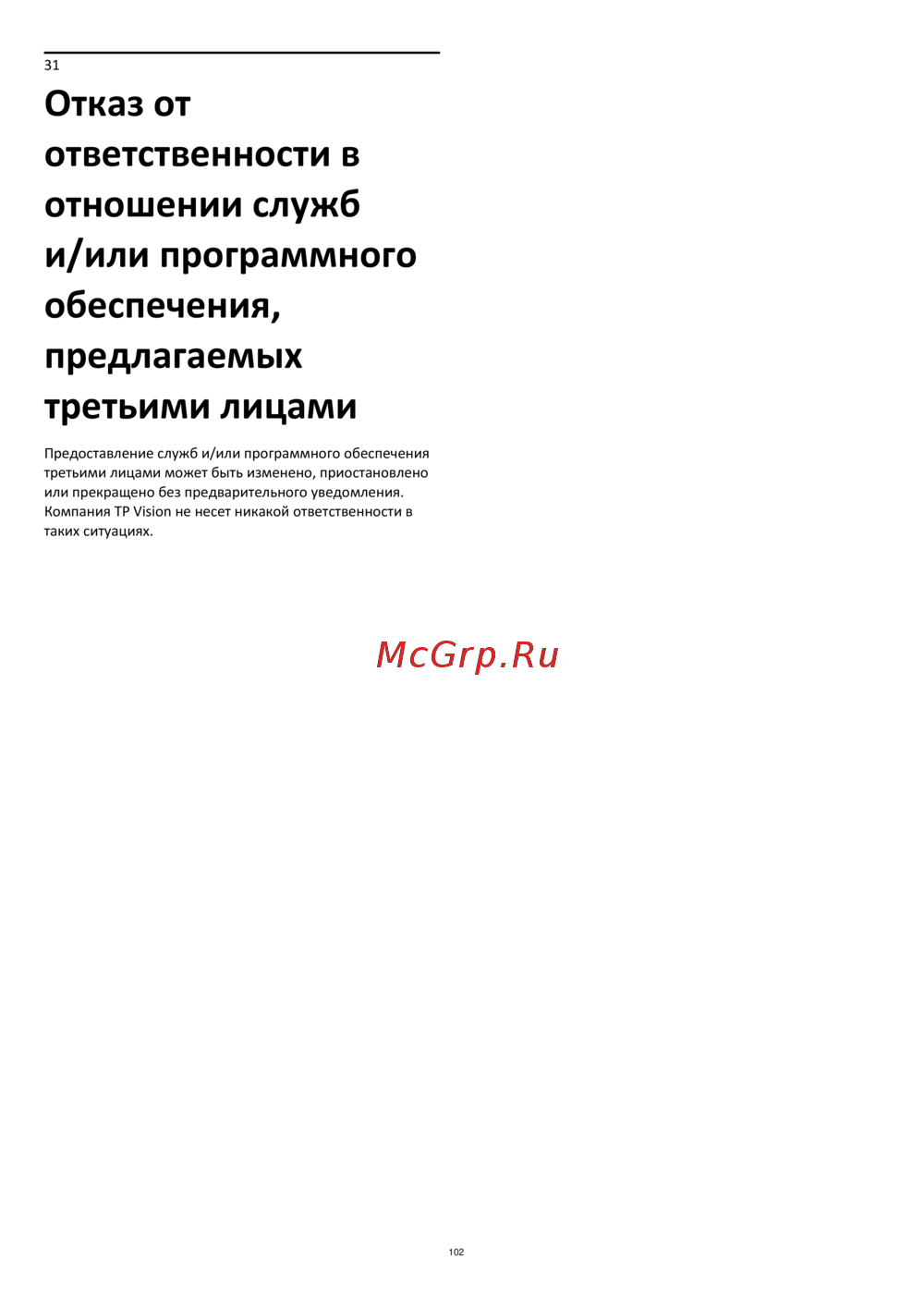 Philips 50PUS8507/60 [102/105] Отказ от ответственности в отношении служб и или программного обеспечения предлагаемых третьими лицами